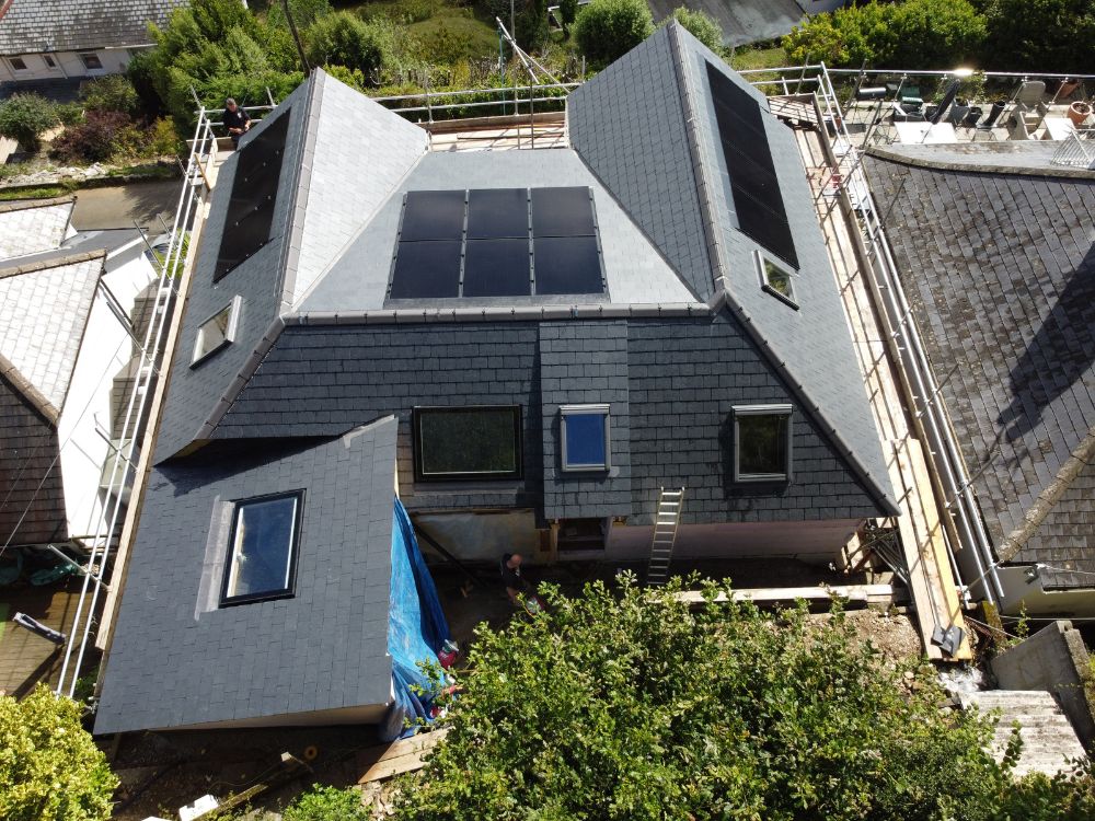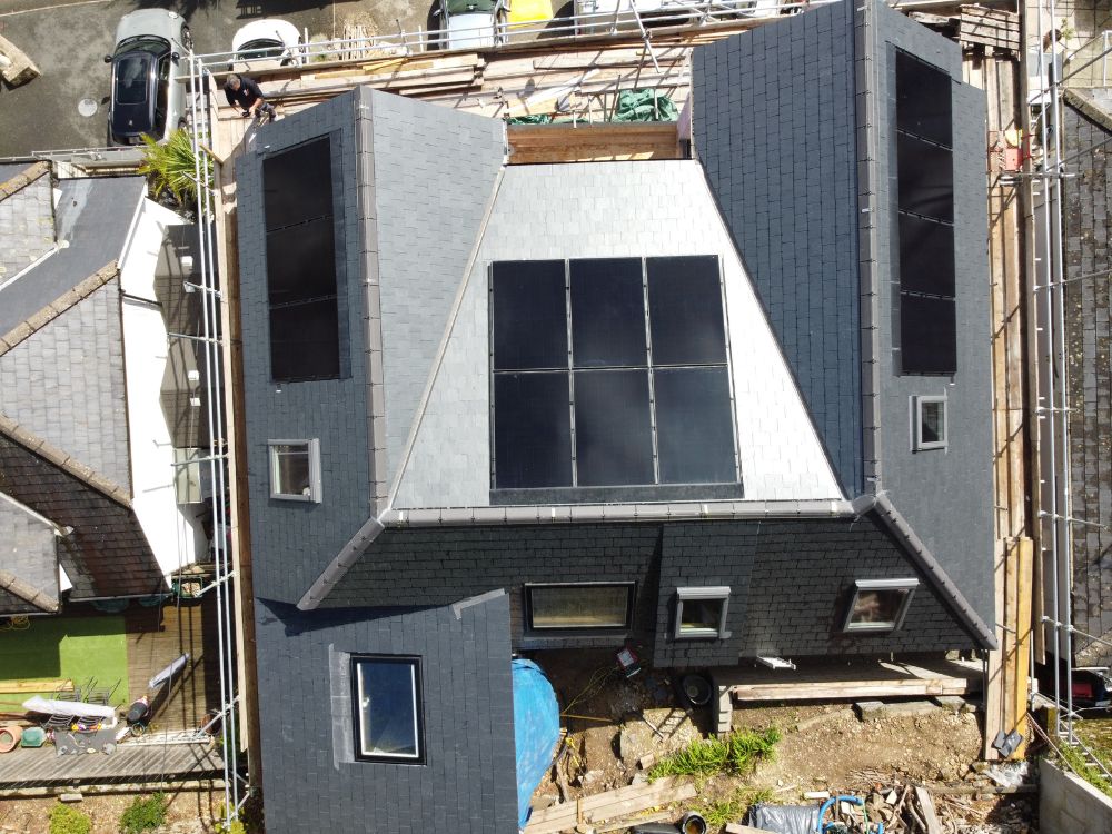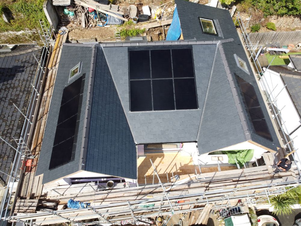 We completed these two roofs for Fred Champion Ground works & construction at Harlyn bay north cornwall in the summer of 2023. Both roofs had a massive roof area of 250m2 and were fitted using reclaimed delabole slates using stainless slate hooks and copper nails. We installed an intergrated solar Pv system to one of the roofs and both roofs were fitted with a ridge line sky light which transformed the interior of the property’s.