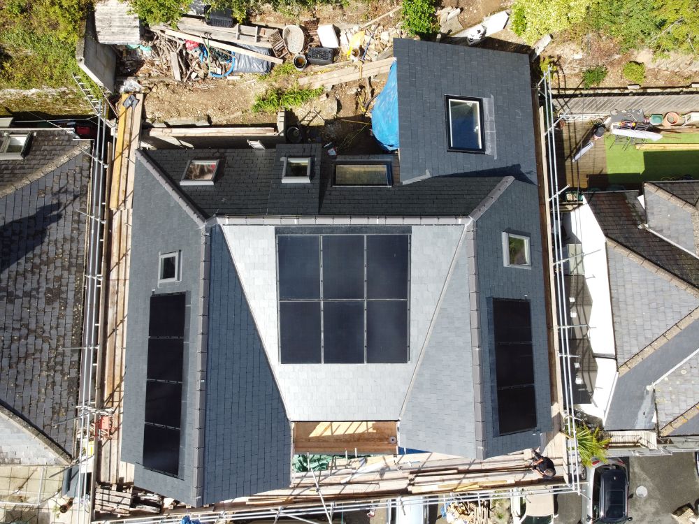 This was a roofing project which as well as using my fantastic work crew, I also had my whole family involved. This is the family home in Plymouth which needed several things doing. As well as fitting a complete new roof which consisted of new 500×250 mm Spanish (Armada) slates using slate hooks and copper nails, we needed to fit two new new flue liners down the chimney It soon became evident that the chimney being around 140 years old was falling apart and needed to be taken down to roof level and rebuilt. We also decided to fit an integrated solar Pv system to the front elevation, fit x2 Velux windows and also a sun tunnel to the rear roof elevation to let in much needed natural light to the upstairs landing and hallway. As you can see from one of the photos I actually had my whole family on the roof with me at one stage