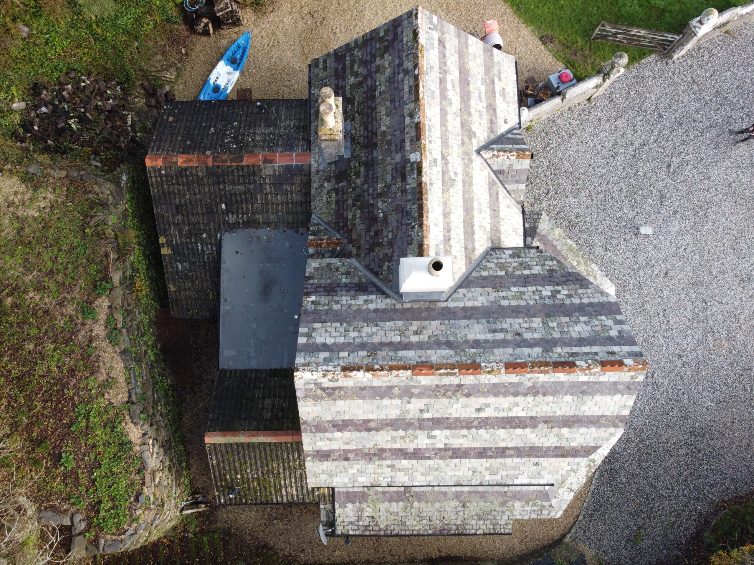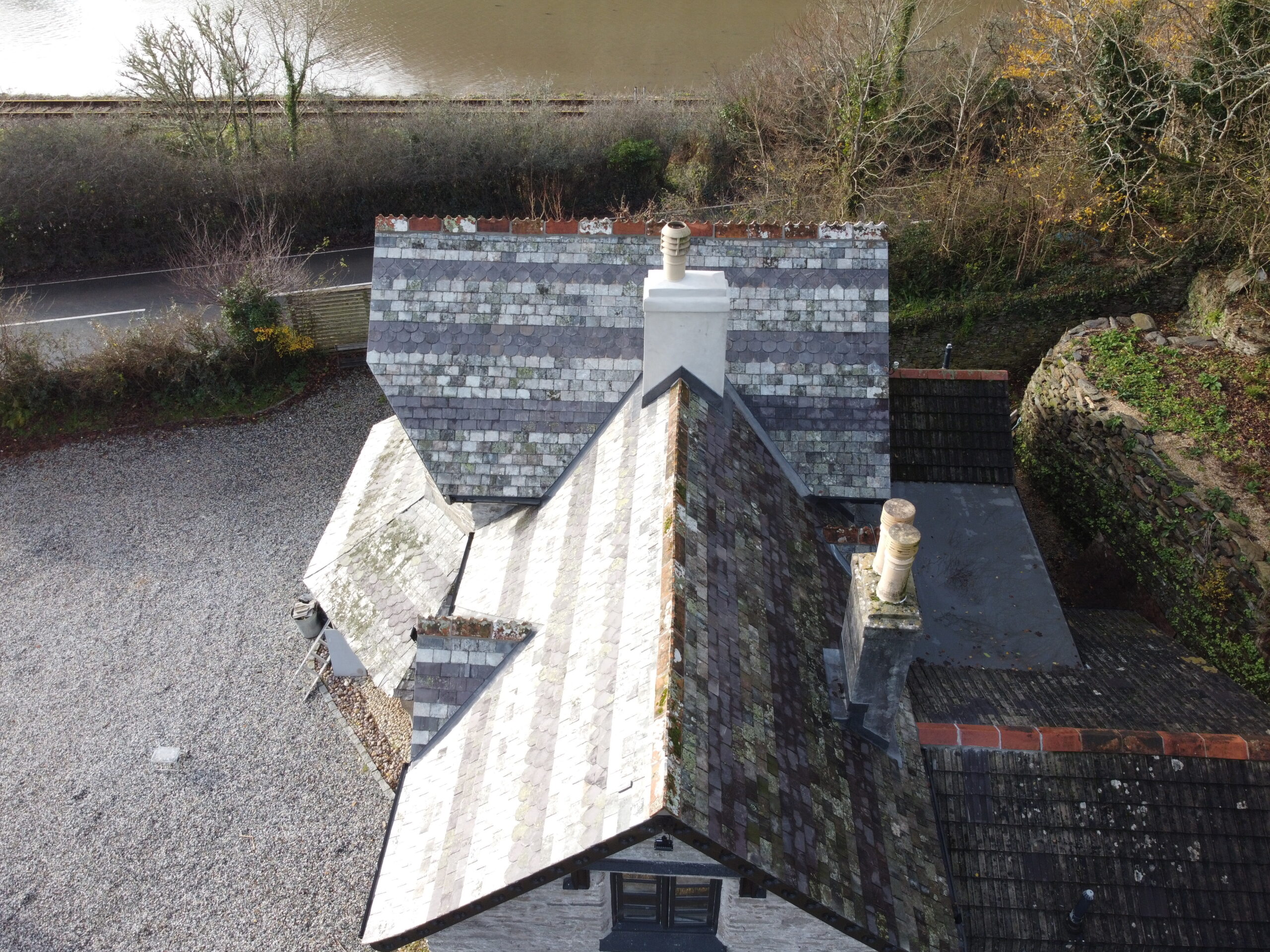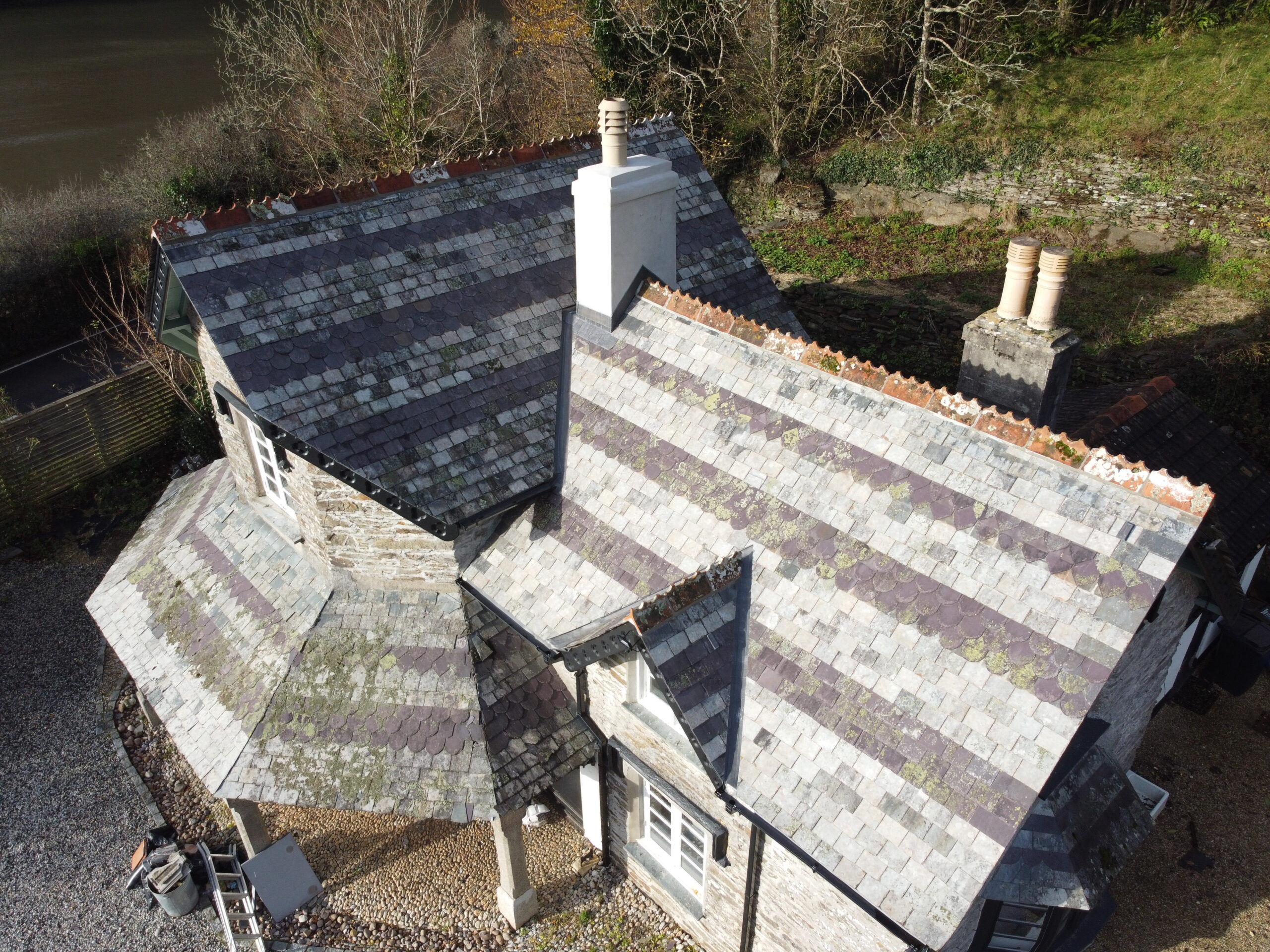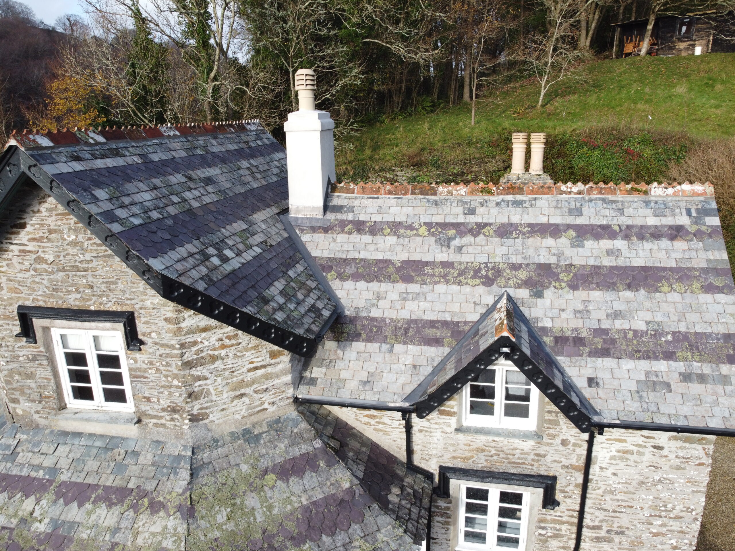 Old Ven Farm Tavistock. Slate Hanging on Chimney and Gable End Using Delabole Slates