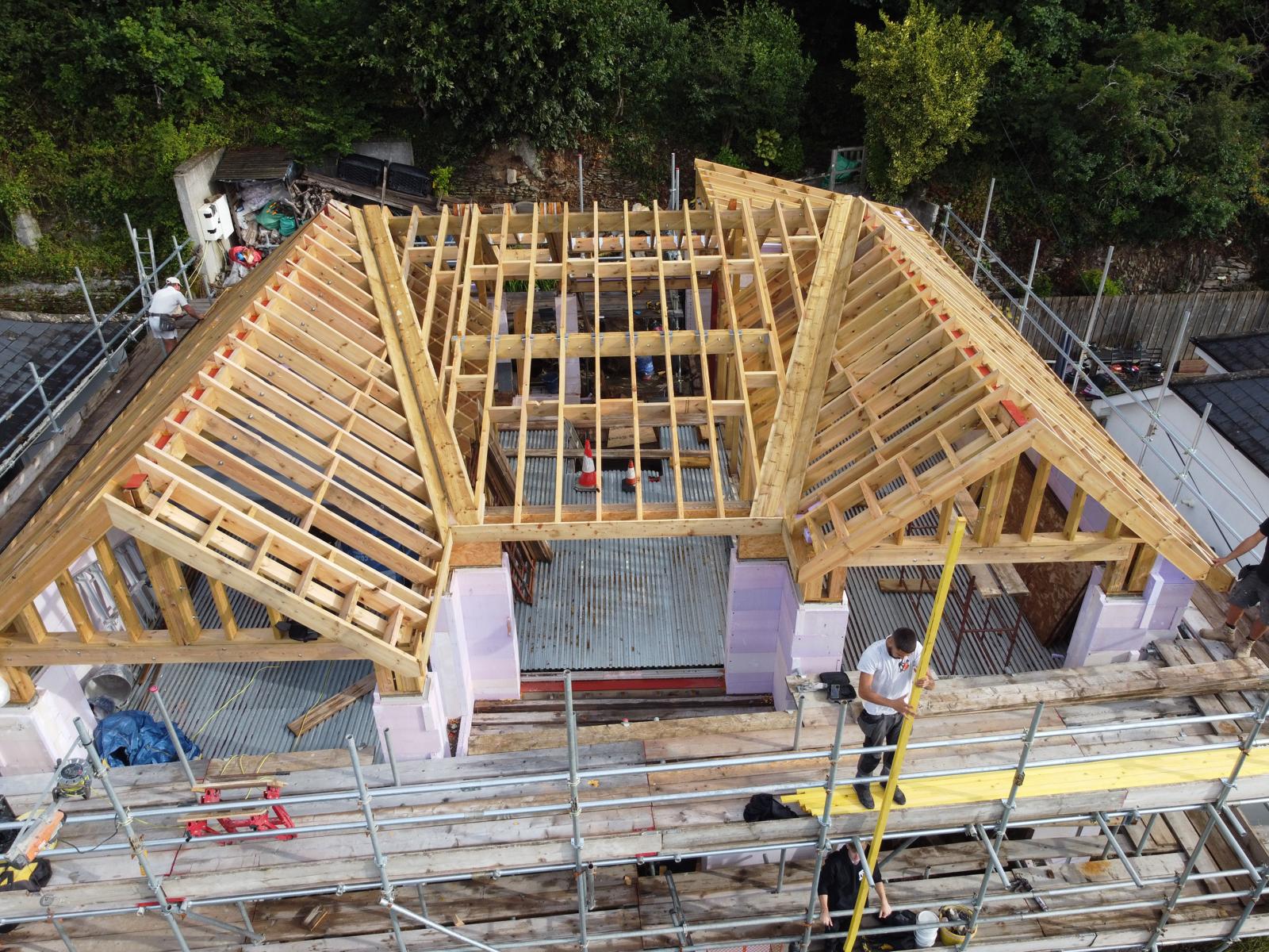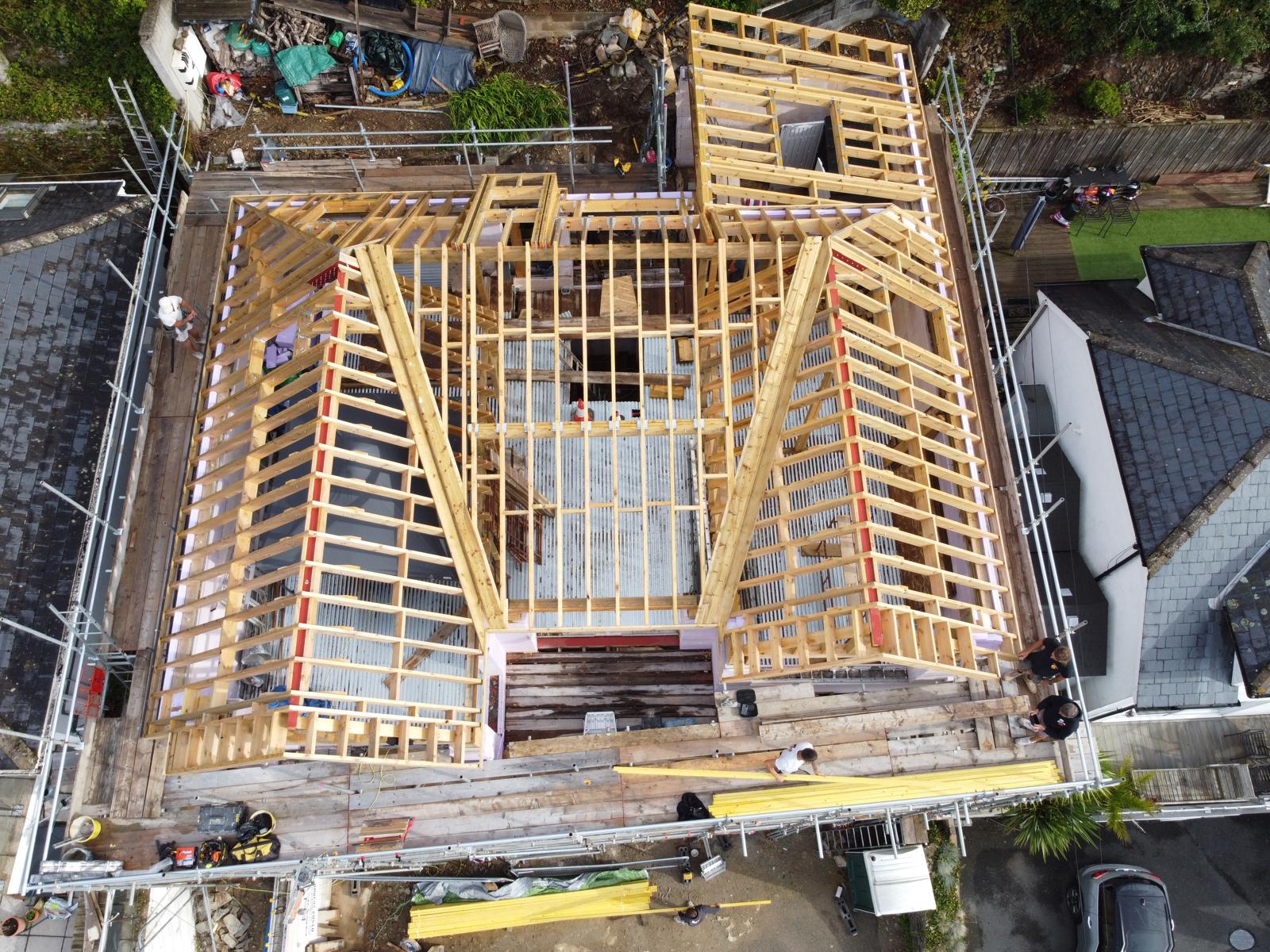 Lower Trebarret House is made up of two buildings, the oldest having a Delabole rag roof, which dates back to 1640. The other roof had 20” by 10” Delabole slates, which was built 150 years late.b Both roofs were suffering from slipped slates, due to nail fatigue and no felt/membrane. Upon removal of the rag slates it became evident that the 2” by 2” rafters and the 3” by 3” purlins were no longer fit for purpose, due to rot and beetle infestation.