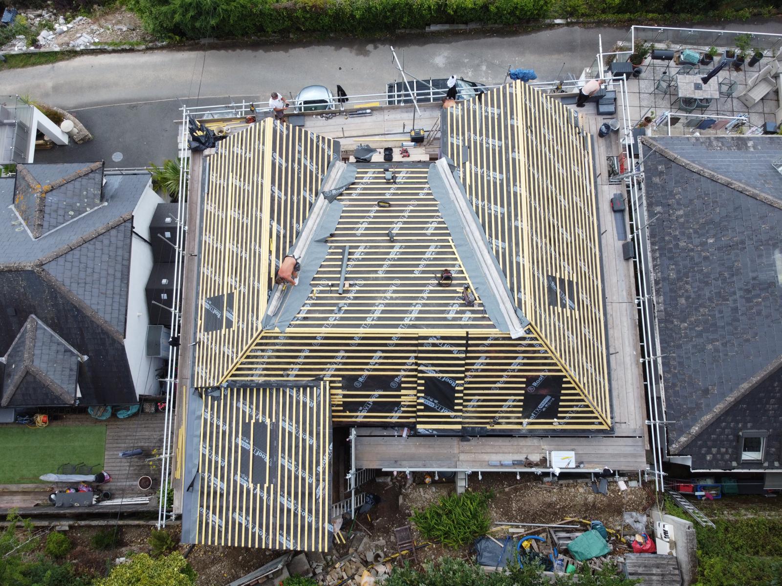 We completed this roof in the winter of 2022. The property near Landrake in Cornwall has a large roof and had been sprayed previously with the dreaded ‘spray foam insulation’ which to be honest is a total disaster. After the painstaking task of removing all the spray foam from the roof timbers it was evident that there had been severe rot caused mainly from trapped condensation which was caused by the spray foam which constricts are flow in the roof space. All the timber rafters had to be removed and replaced with new along with new timber wall plates. We used dark grey 500x250mm Spanish slates with slate hooks. We also fitted new code 5 lead work to the hips on the bay roof on the rear roof elevation.